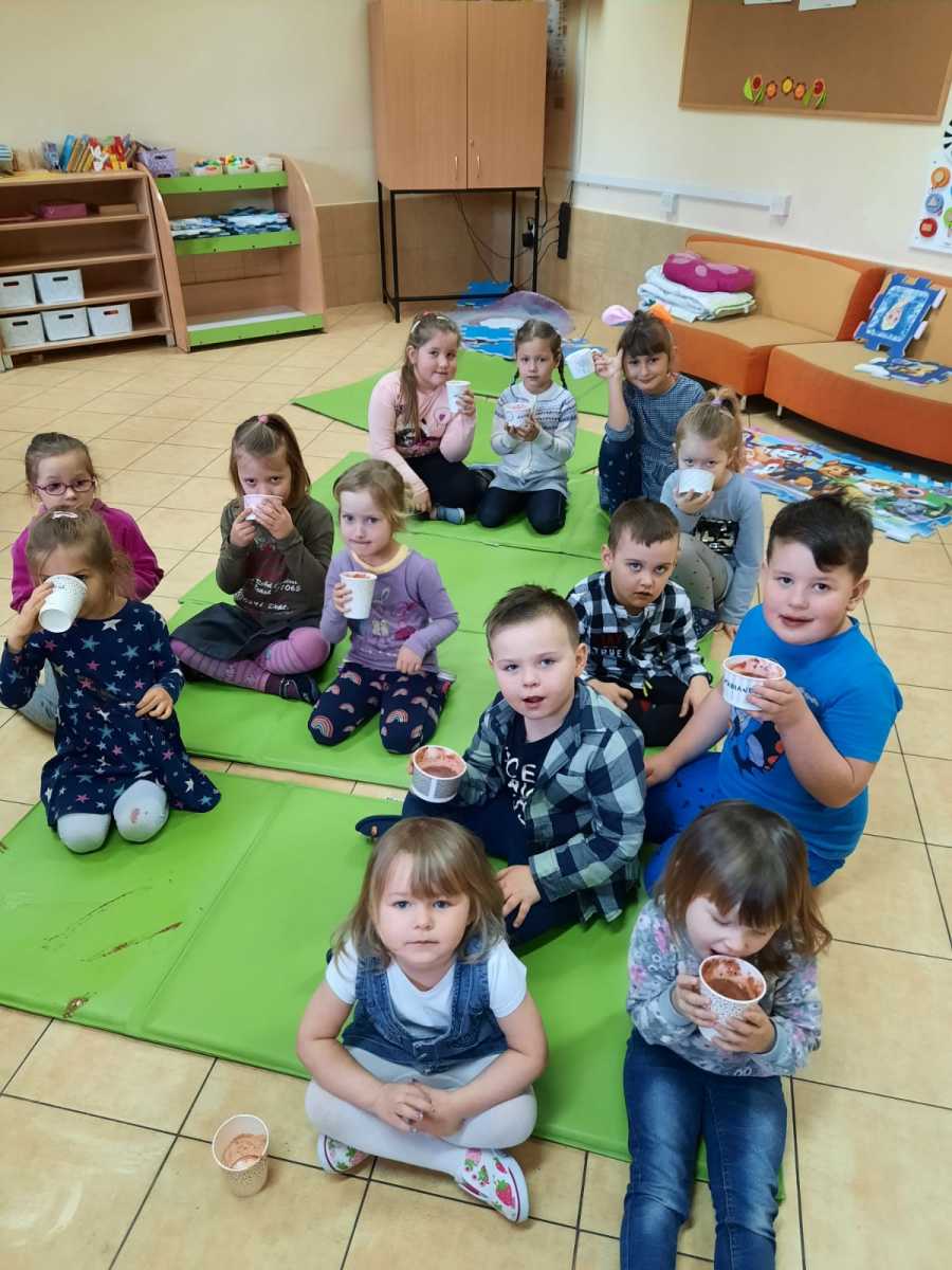 W dniu 10 marca 2021 r. w oddziale przedszkolnym odbyły się zajęcia związane ze zdrowym odżywianiem. Zadaniem uczestników było samodzielne przygotowanie koktajlu tzw. smoothie z przyniesionych owoców (banany, mandarynki, jabłka, gruszki, truskawki, borówki, kiwi, pomarańcze) na bazie soku jabłkowego. Dzieci bardzo chętnie kosztowały kolorowych przysmaków.