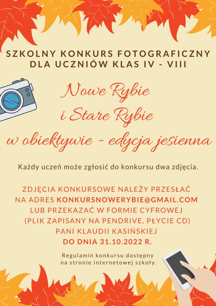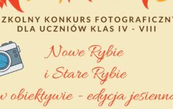 Samorząd Szkolny zaprasza do udziału w szkolnym konkursie fotograficznym „Nowe Rybie i Stare Rybie w obiektywie – edycja jesienna”. Każdy uczeń z klas IV – VIII może zgłosić do konkursu dwa zdjęcia, własnego autorstwa. Prace należy przesłać do dnia 31.10.2022.