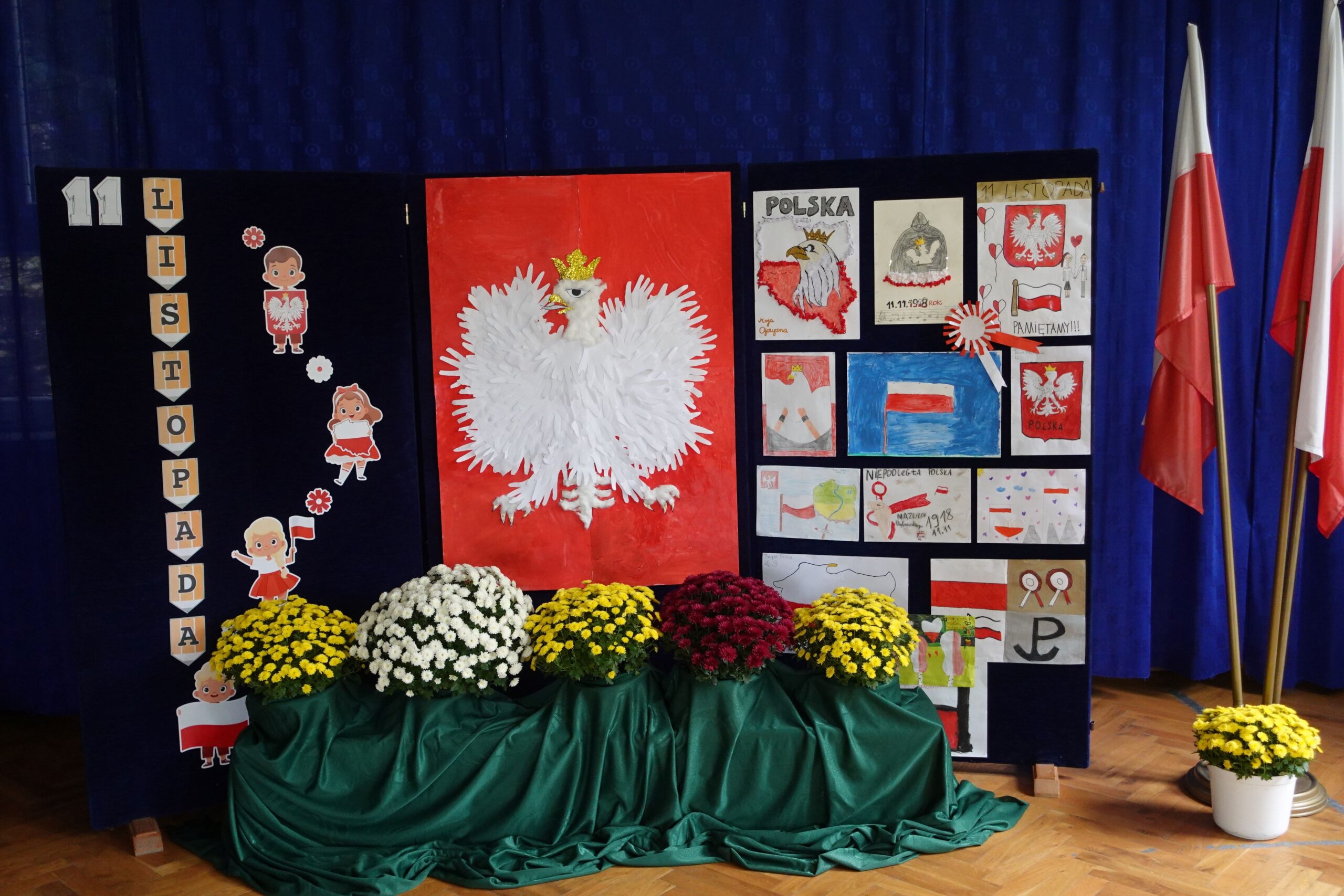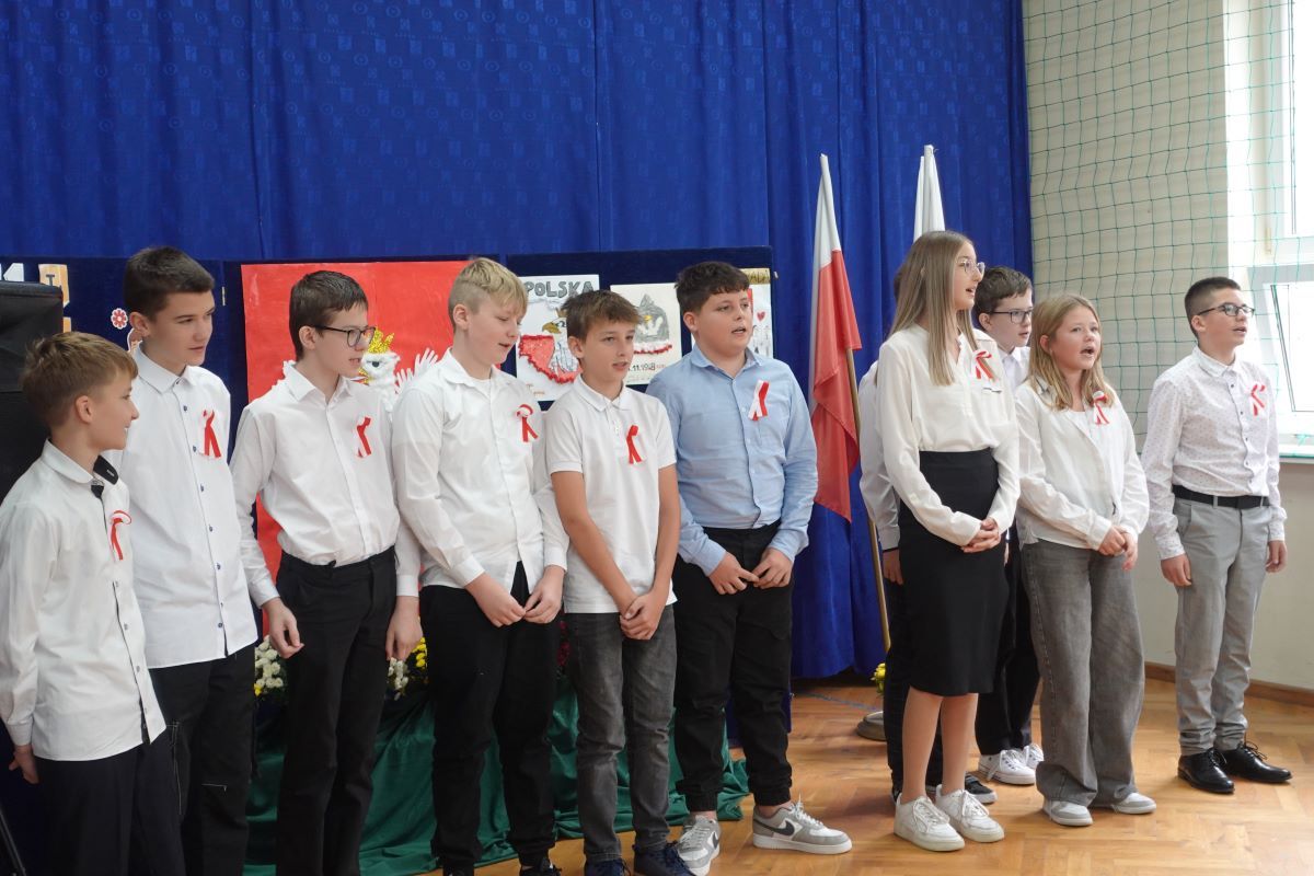 Dzień ten był wyjątkowy dla naszej szkolnej społeczności. Uczniowie i dzieci z oddziałów przedszkolnych uczestniczyli w międzyklasowym konkursie piosenki patriotycznej. Wszystkie grupy pięknie i zaangażowaniem zaśpiewały na szkolnej scenie przygotowane pieśni. Poziom był wysoki i wyrównany.