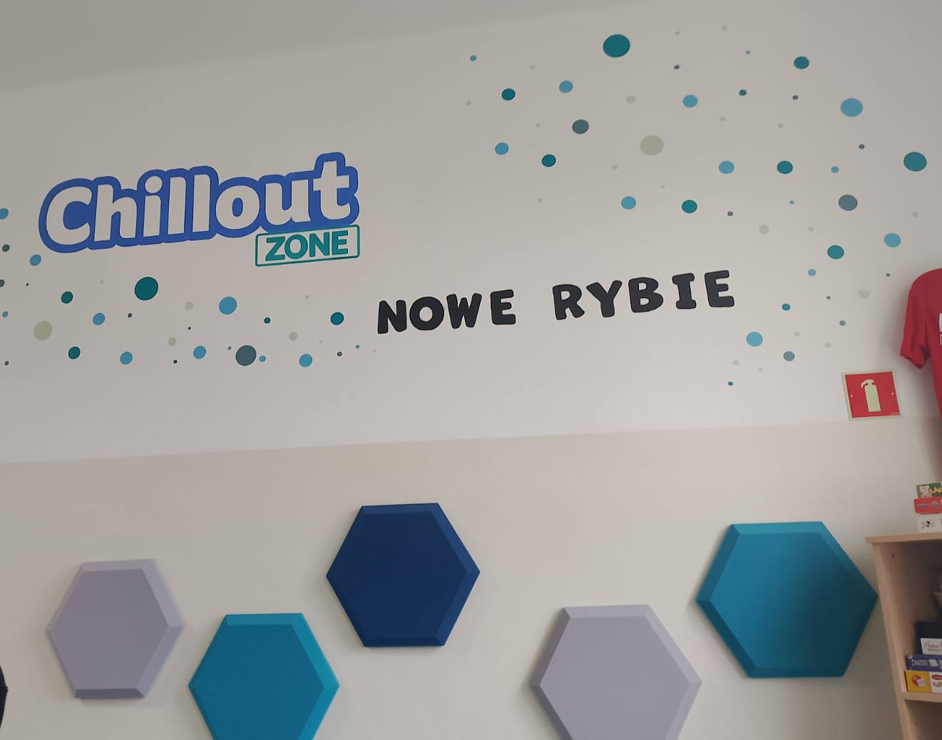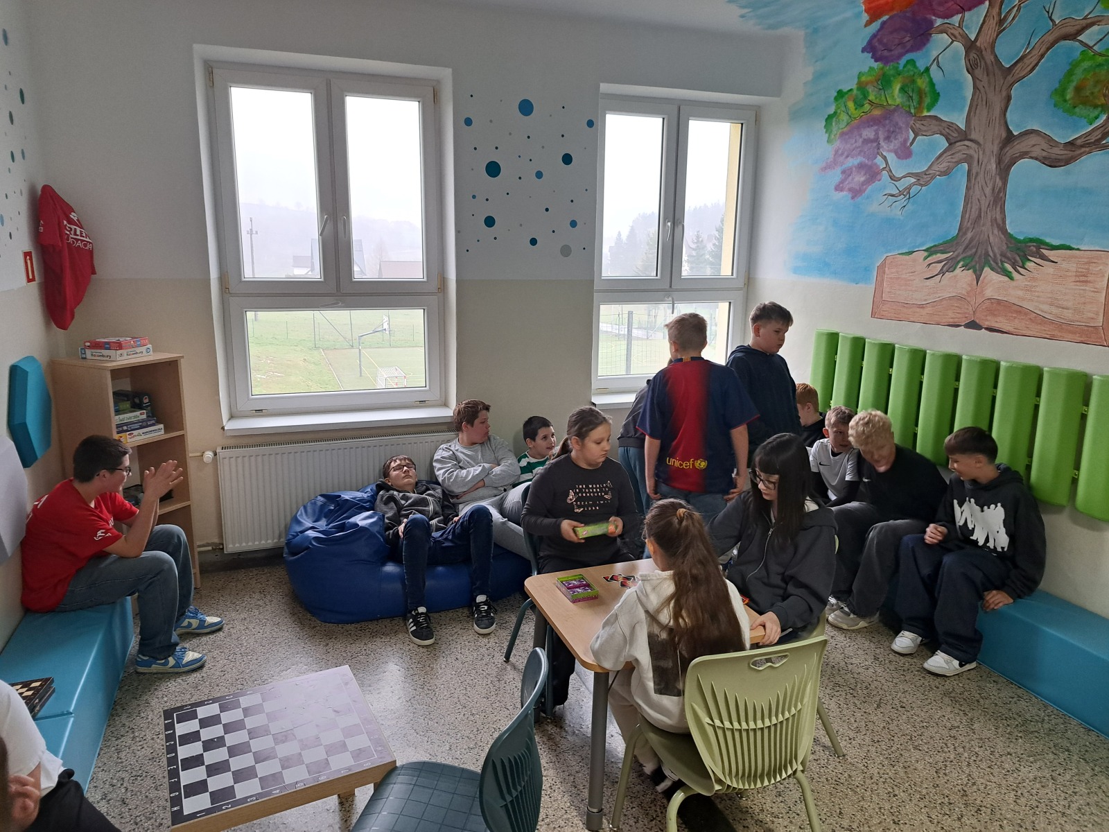 Strefa relaksu została urządzona w specjalnie zaadaptowanym miejscu. Znalazły się w niej m.in. wygodne pufy i fotele, lampki emitujące ciepłe światło, książki, gry planszowe, stoliki i krzesełka oraz maty wyciszające. Główną ozdobą tego miejsca jest mural, wykonany własnoręcznie przez Panią Katarzynę Stalmach, która zadbała o najdrobniejszy szczegół wizualny, spędzając wiele godzin przy tworzeniu swojego działa. Całość tego kącika została zaprojektowana z myślą o komforcie i potrzebach młodych ludzi.