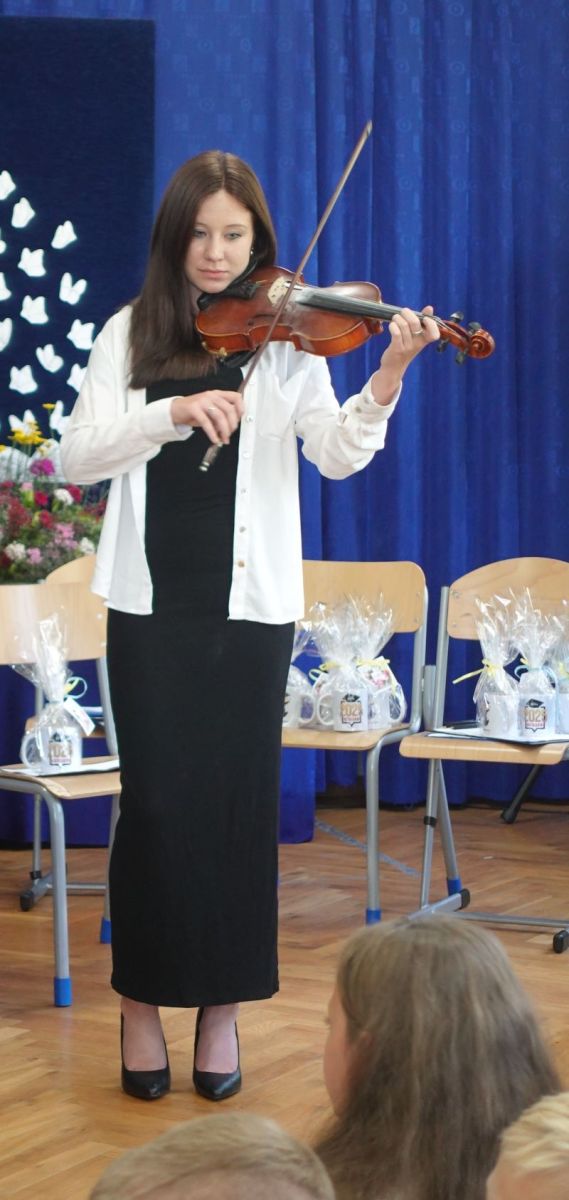 Następnie przedstawiciele klasy ósmej wygłosili podziękowania rodzicom, nauczycielom, wychowawcy oraz wszystkim pracownikom szkoły za trud, wsparcie i wspólnie spędzone lata. Uroczystość wzbogacił ostatni występ grupy wokalnej GLORIA oraz koncert na skrzypcach Emilii.