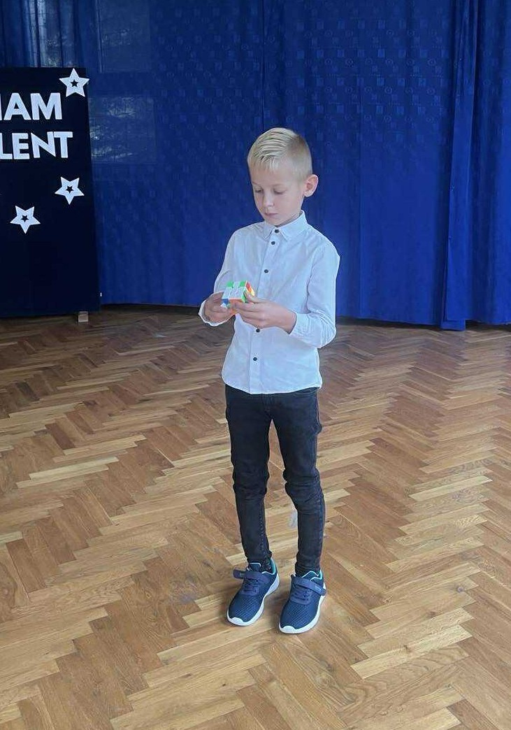 Na scenie zaprezentowali się utalentowani uczniowie naszej szkoły, prezentując różnorodne umiejętności. Publiczność mogła podziwiać śpiew, taniec akrobatyczny, pokaz sztuki walki z mieczem, a także układanie kostki Rubika na czas, grę na instrumentach oraz talent plastyczny uczestników, którzy zachwycili swoimi rysunkami i obrazami. Nie zabrakło również pokazu piłki nożnej oraz filmików, na których uczniowie przedstawili swoje hobby i pasje.