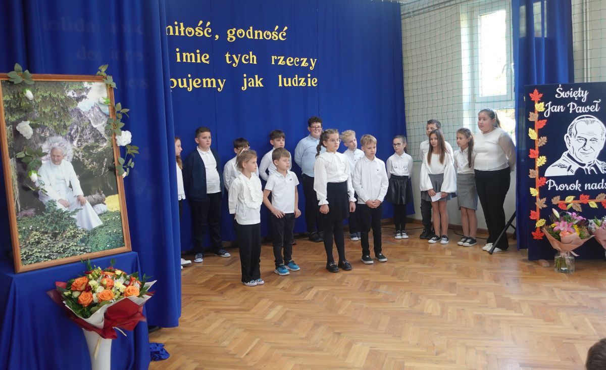 Uroczystość rozpoczęła się akademią przygotowaną przez uczniów klasy 1 i 4, którzy przypomnieli najważniejsze momenty z życia papieża Polaka. Uczniowie przedstawili wzruszające wspomnienia, jak i fragmenty poezji Karola Wojtyły. Nie zabrakło też pieśni, które wszyscy znamy i chętnie śpiewamy – „Barka” rozbrzmiała głośno i z serca.
