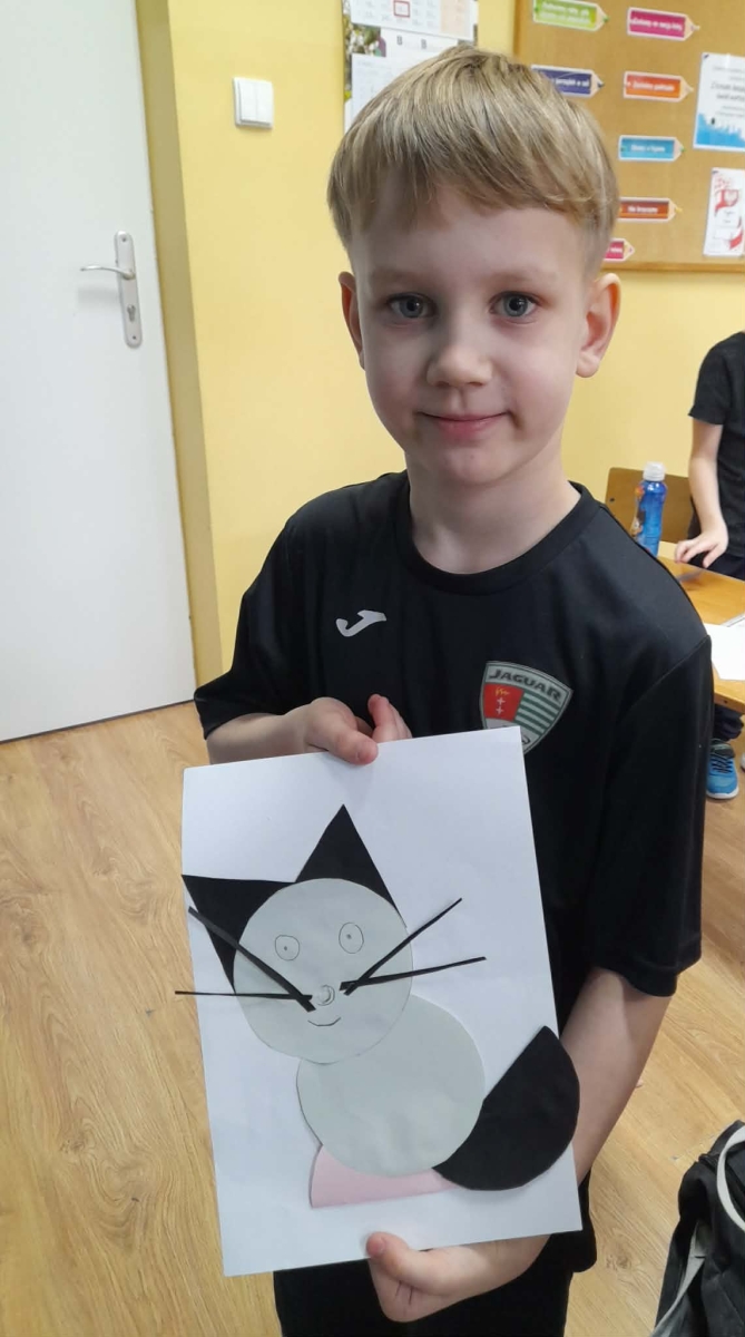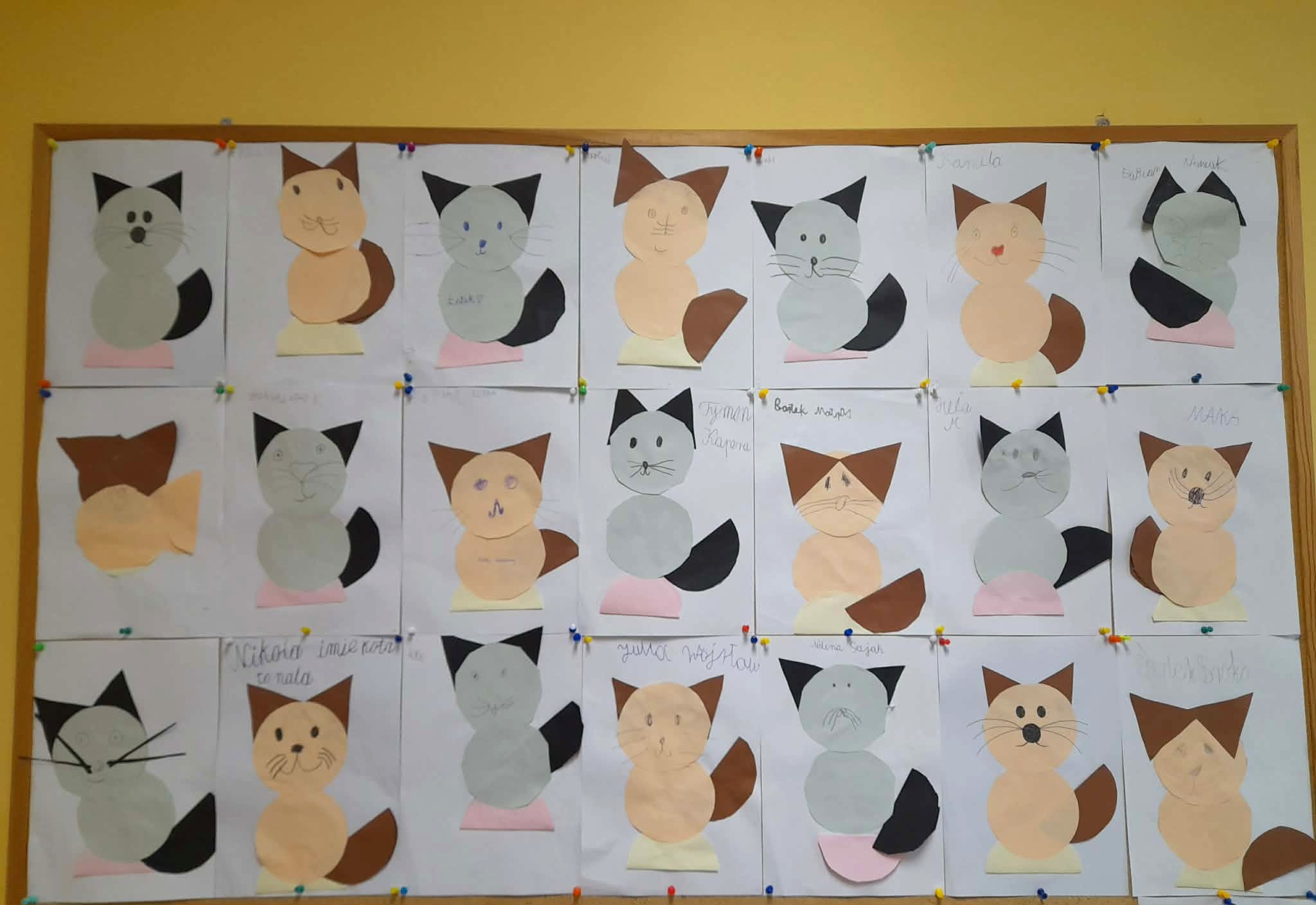 Podsumowaniem zajęć była praca plastyczna – portret kota wykonany techniką origami z kółek. Dzieci z ogromnym zaangażowaniem tworzyły swoje prace, wykazując się kreatywnością i starannością. Powstały wyjątkowe, kolorowe koty, które stały się piękną dekoracją naszej sali.