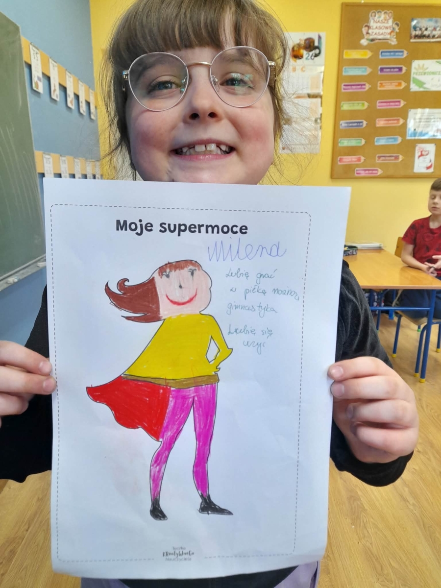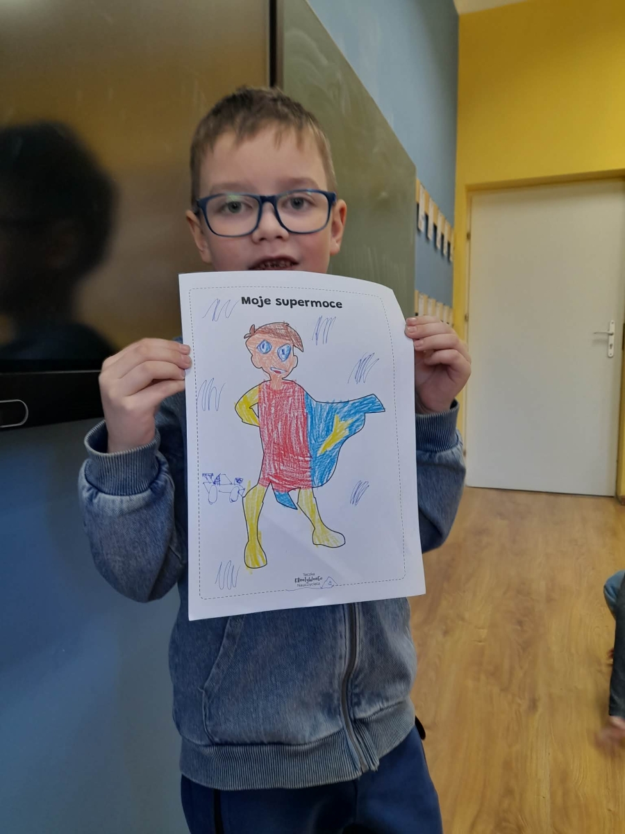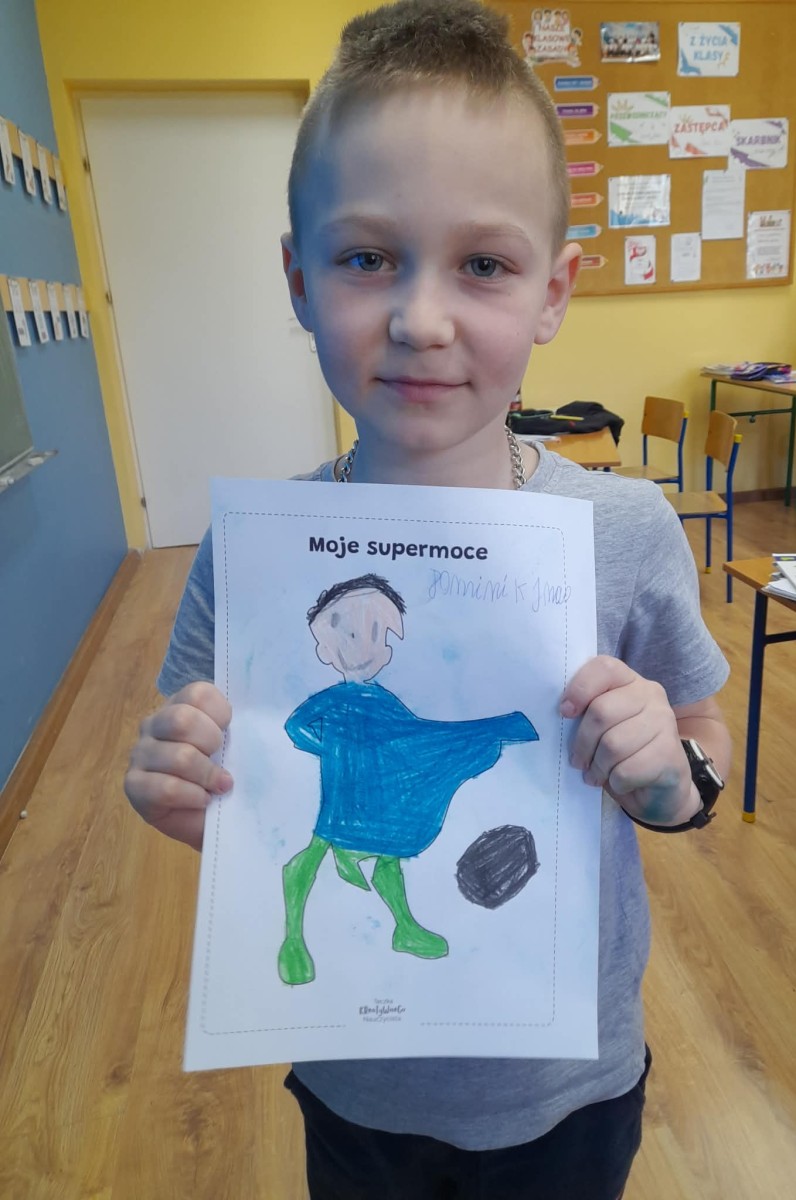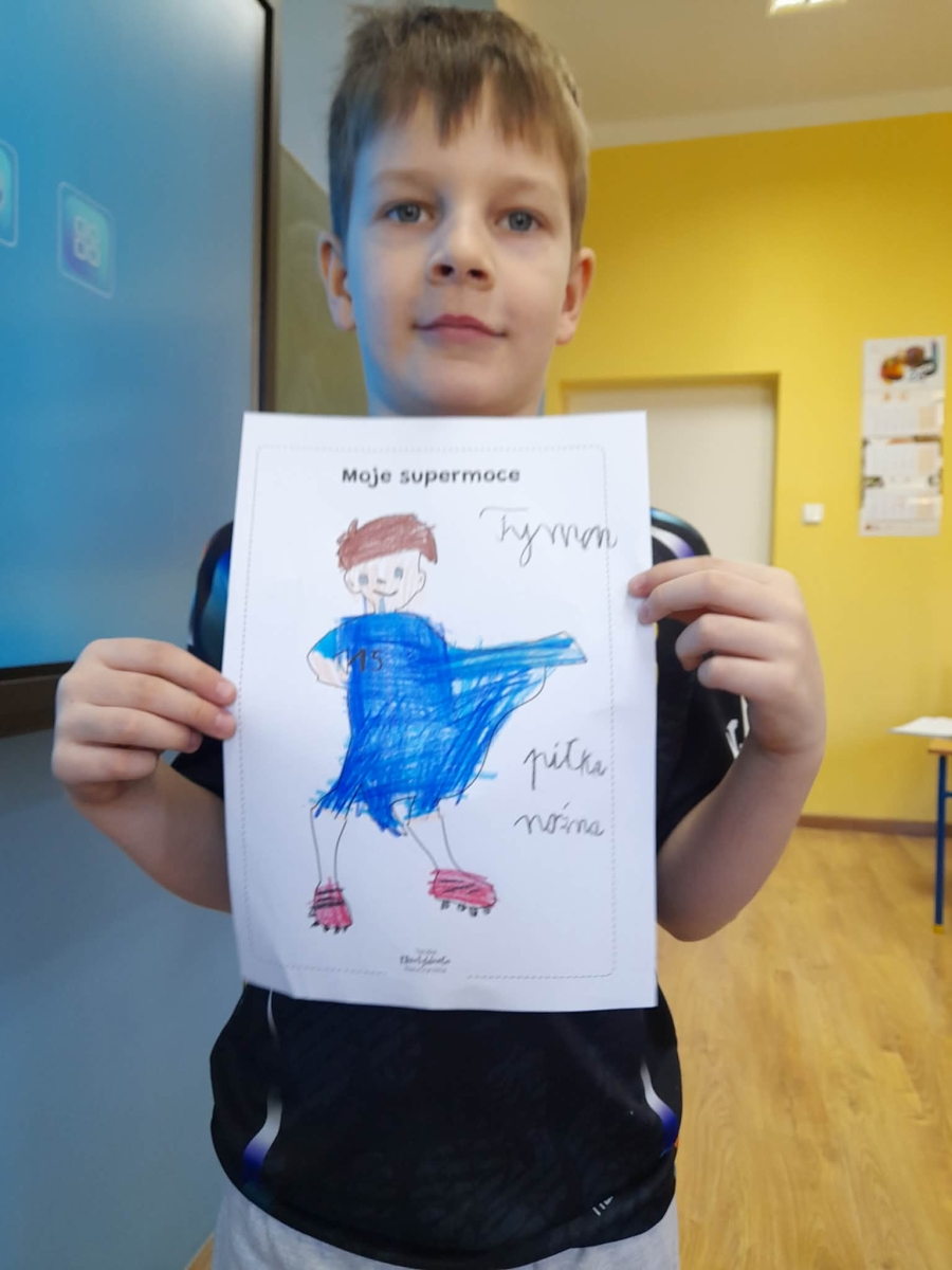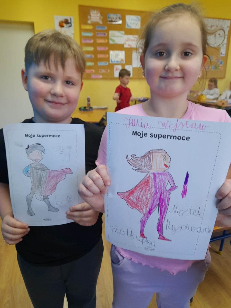 Podczas wspólnej dyskusji dzieci zastanawiały się nad własnymi zainteresowaniami, pasjami oraz tym, w czym czują się najlepiej. Następnie każdy uczeń przygotował pracę plastyczną, w której graficznie przedstawił swoje talenty i zainteresowania jako „Supermoce”. Dzięki temu dzieci mogły lepiej poznać siebie nawzajem, a także dostrzec, że każdy z nas jest wyjątkowy. Zajęcia były doskonałą okazją do budowania poczucia własnej wartości, rozwijania kreatywności oraz wzmacniania wiary we własne możliwości.