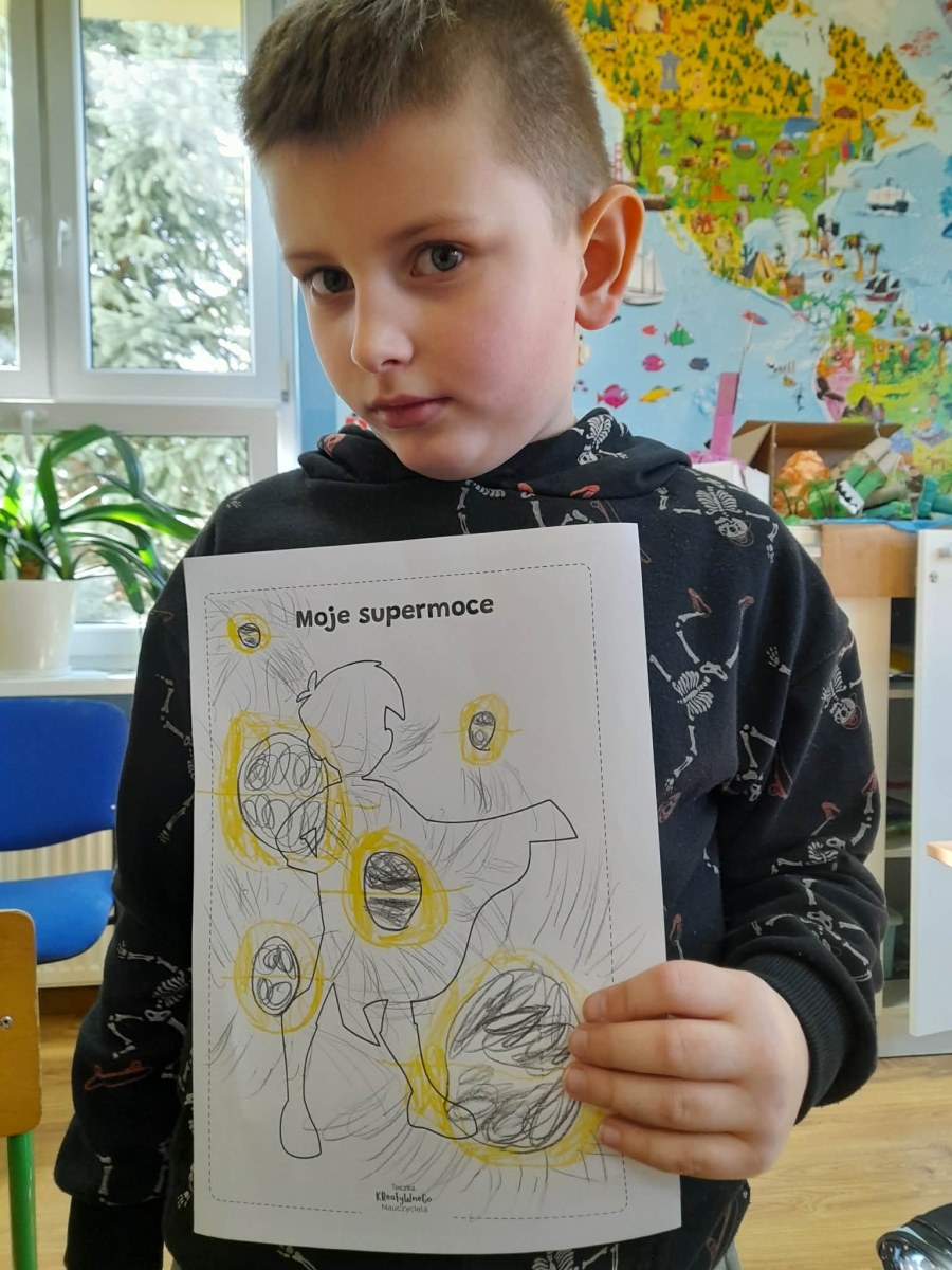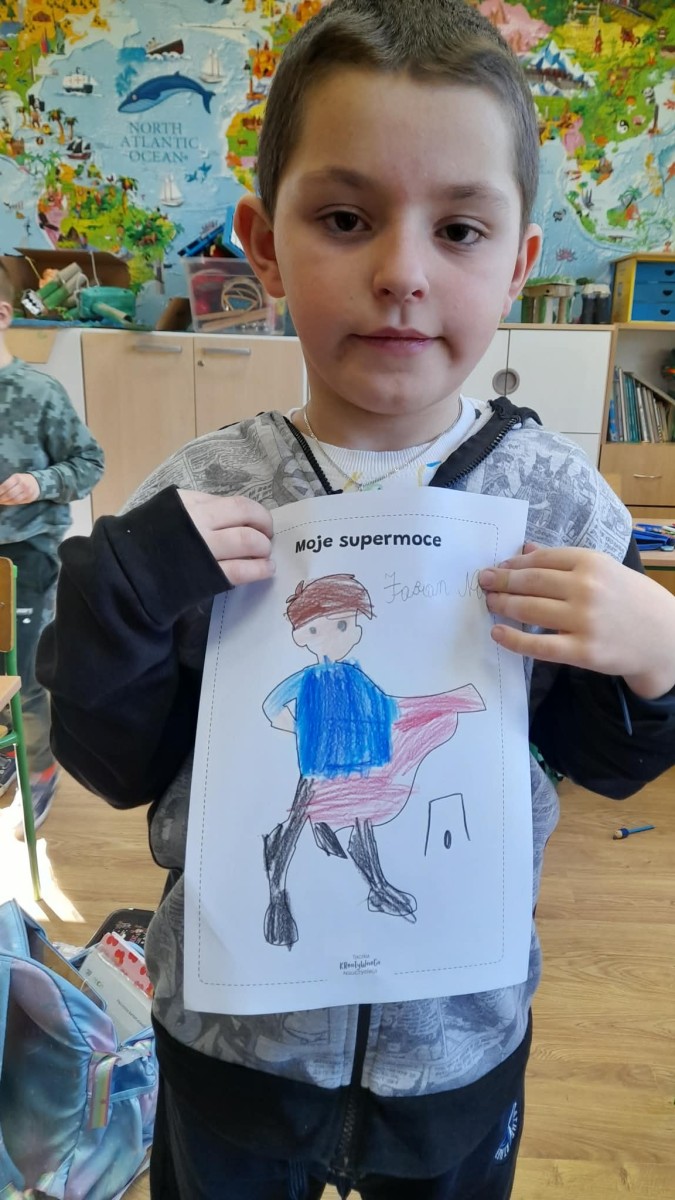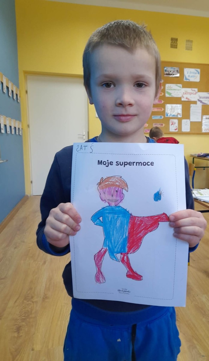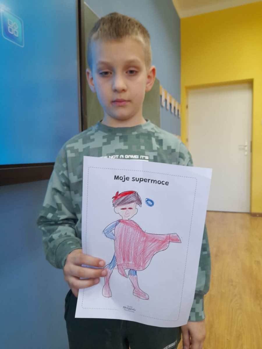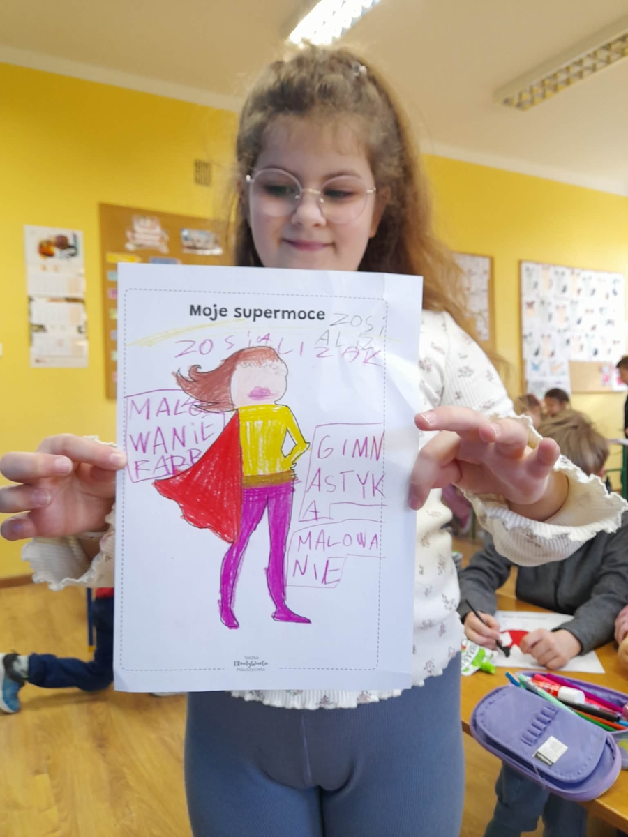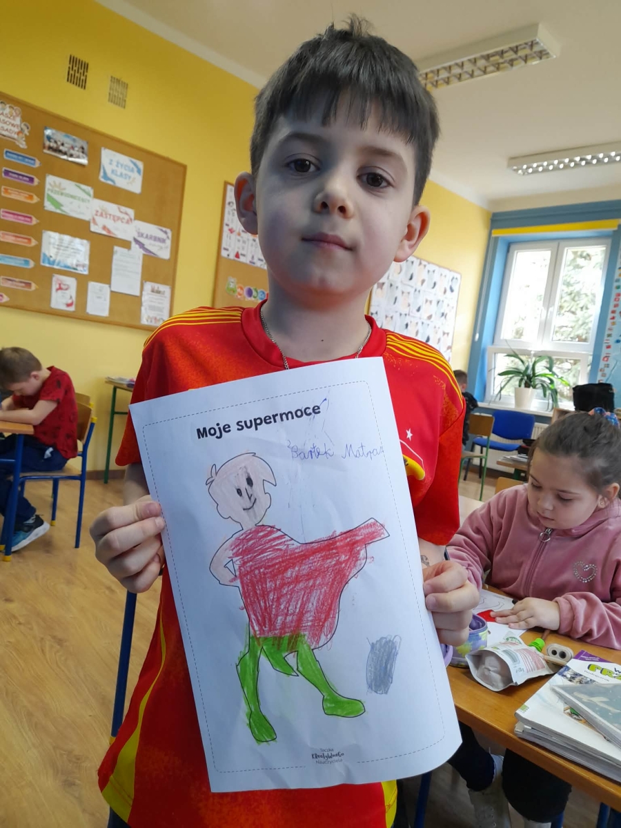 Podczas wspólnej dyskusji dzieci zastanawiały się nad własnymi zainteresowaniami, pasjami oraz tym, w czym czują się najlepiej. Następnie każdy uczeń przygotował pracę plastyczną, w której graficznie przedstawił swoje talenty i zainteresowania jako „Supermoce”. Dzięki temu dzieci mogły lepiej poznać siebie nawzajem, a także dostrzec, że każdy z nas jest wyjątkowy. Zajęcia były doskonałą okazją do budowania poczucia własnej wartości, rozwijania kreatywności oraz wzmacniania wiary we własne możliwości.