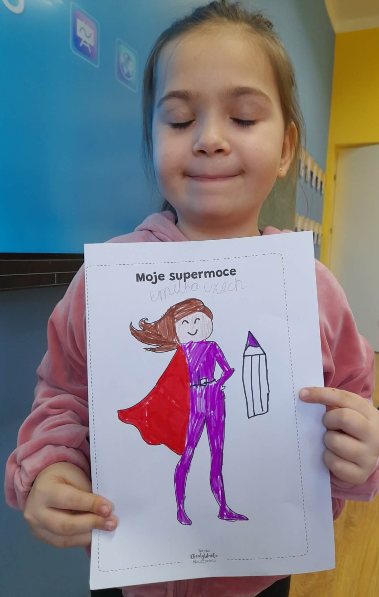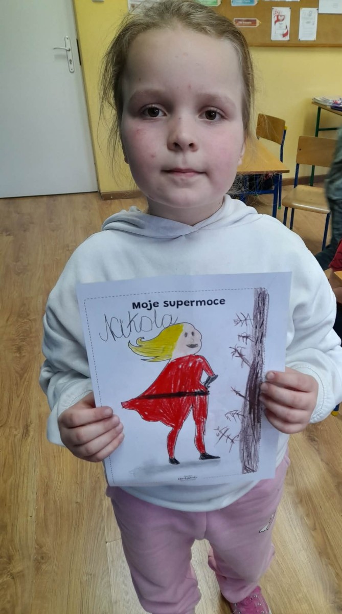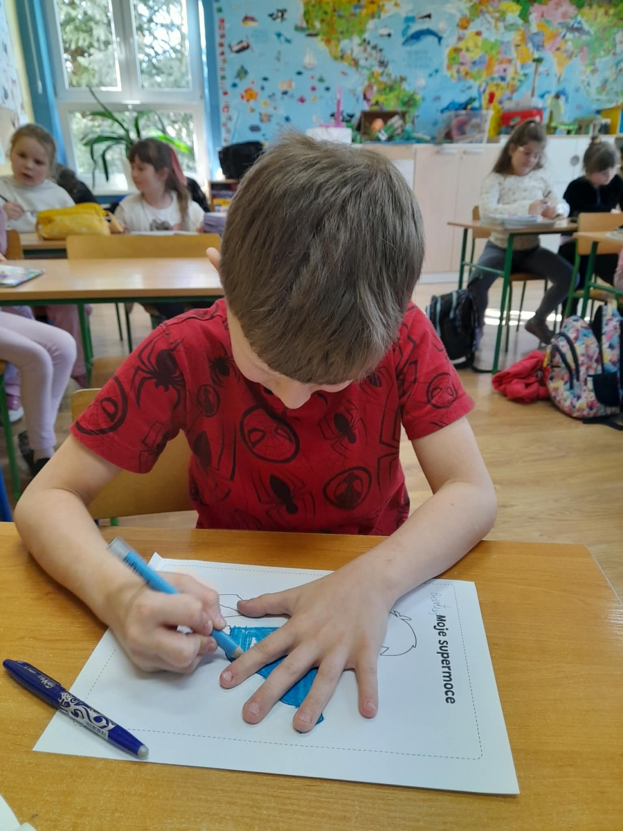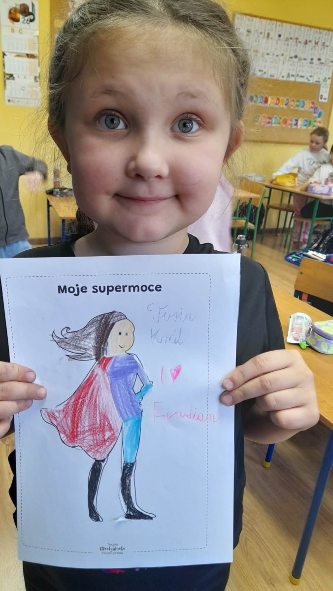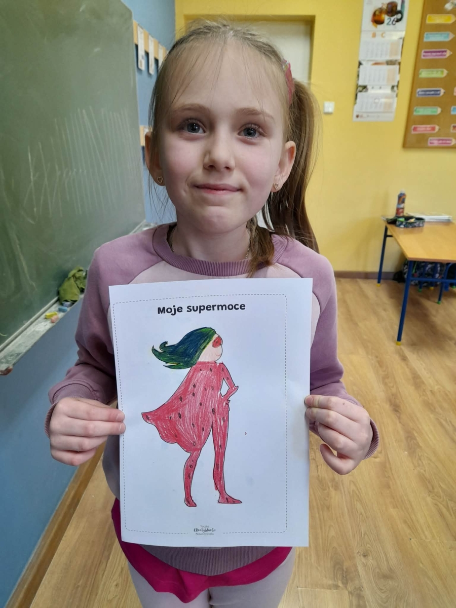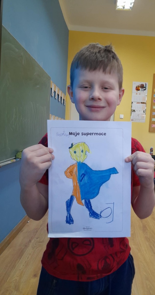 Podczas wspólnej dyskusji dzieci zastanawiały się nad własnymi zainteresowaniami, pasjami oraz tym, w czym czują się najlepiej. Następnie każdy uczeń przygotował pracę plastyczną, w której graficznie przedstawił swoje talenty i zainteresowania jako „Supermoce”. Dzięki temu dzieci mogły lepiej poznać siebie nawzajem, a także dostrzec, że każdy z nas jest wyjątkowy. Zajęcia były doskonałą okazją do budowania poczucia własnej wartości, rozwijania kreatywności oraz wzmacniania wiary we własne możliwości.