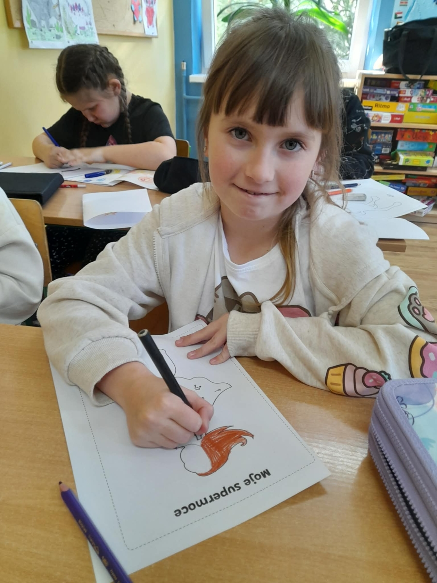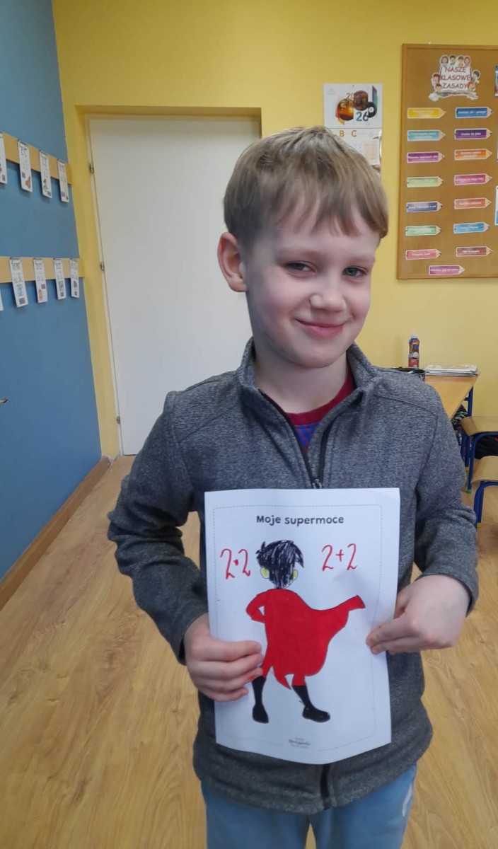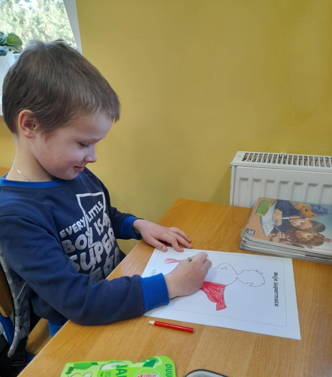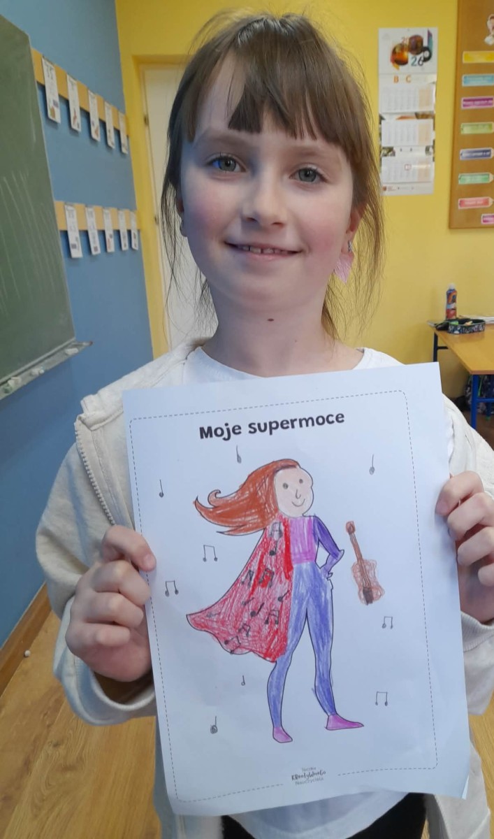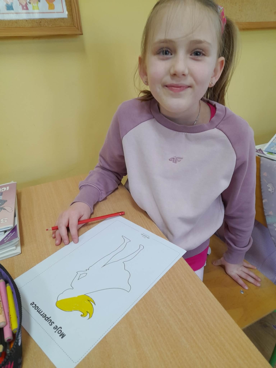 Podczas wspólnej dyskusji dzieci zastanawiały się nad własnymi zainteresowaniami, pasjami oraz tym, w czym czują się najlepiej. Następnie każdy uczeń przygotował pracę plastyczną, w której graficznie przedstawił swoje talenty i zainteresowania jako „Supermoce”. Dzięki temu dzieci mogły lepiej poznać siebie nawzajem, a także dostrzec, że każdy z nas jest wyjątkowy. Zajęcia były doskonałą okazją do budowania poczucia własnej wartości, rozwijania kreatywności oraz wzmacniania wiary we własne możliwości.