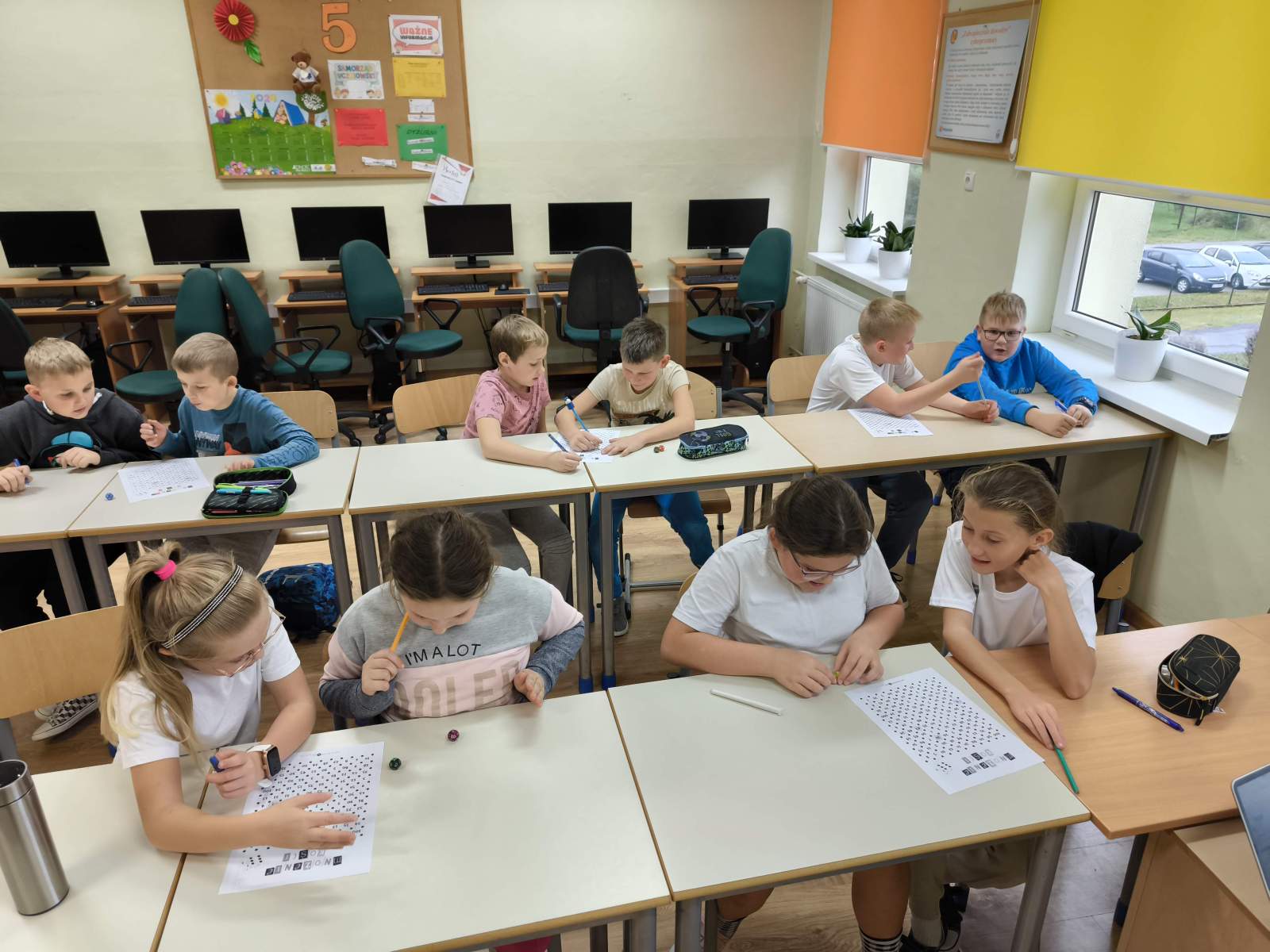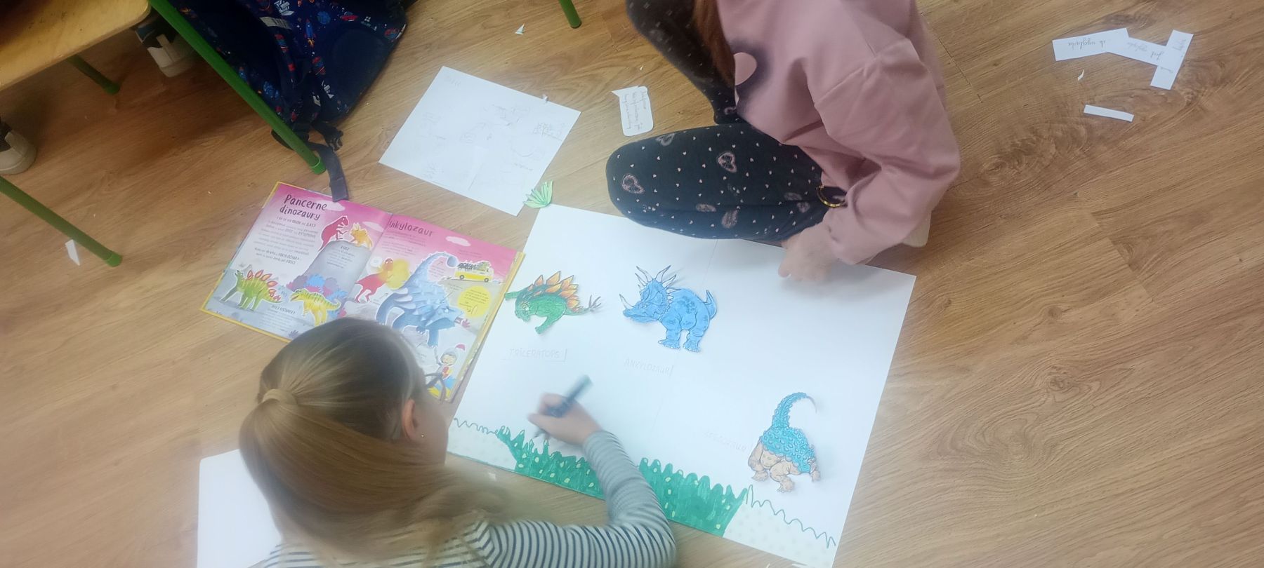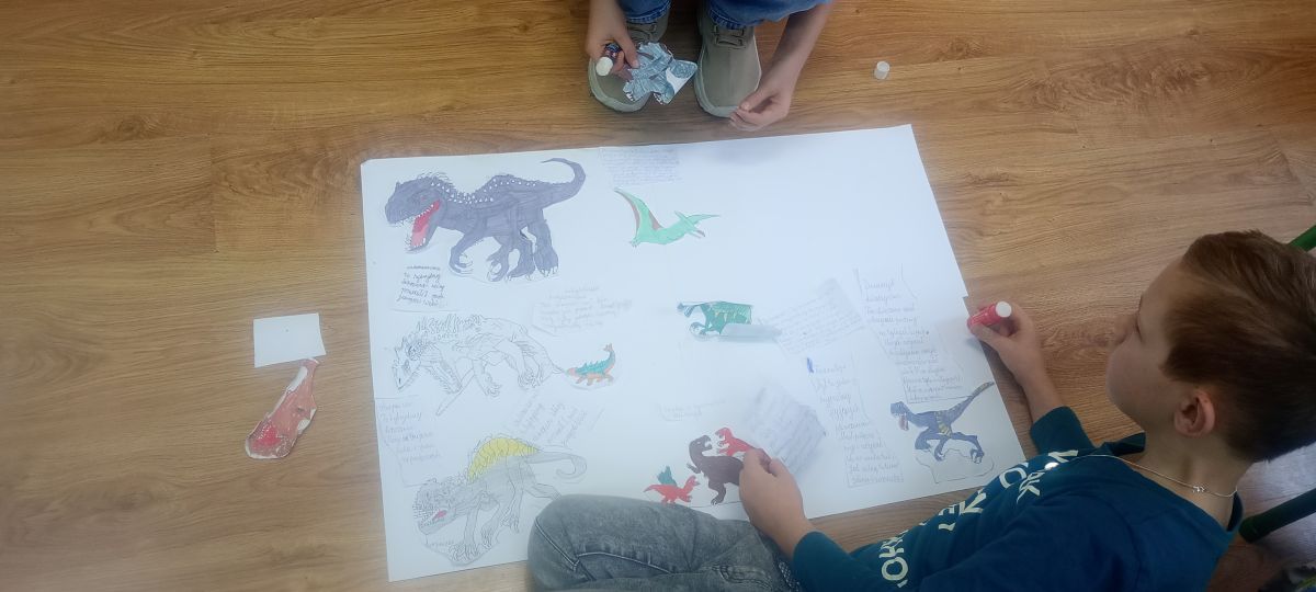 Nie zabrakło również zajęć plastycznych. Uczniowie tworzyli dinozaury z rolek po papierze, przygotowywali plakaty przedstawiające wybrane gatunki dinozaurów oraz wspólnie malowali wielką „gigantyczną” kolorowankę z dinozaurami.