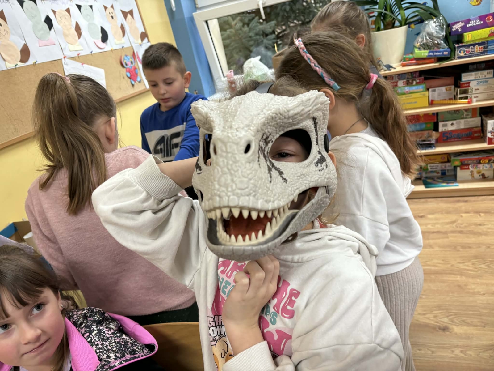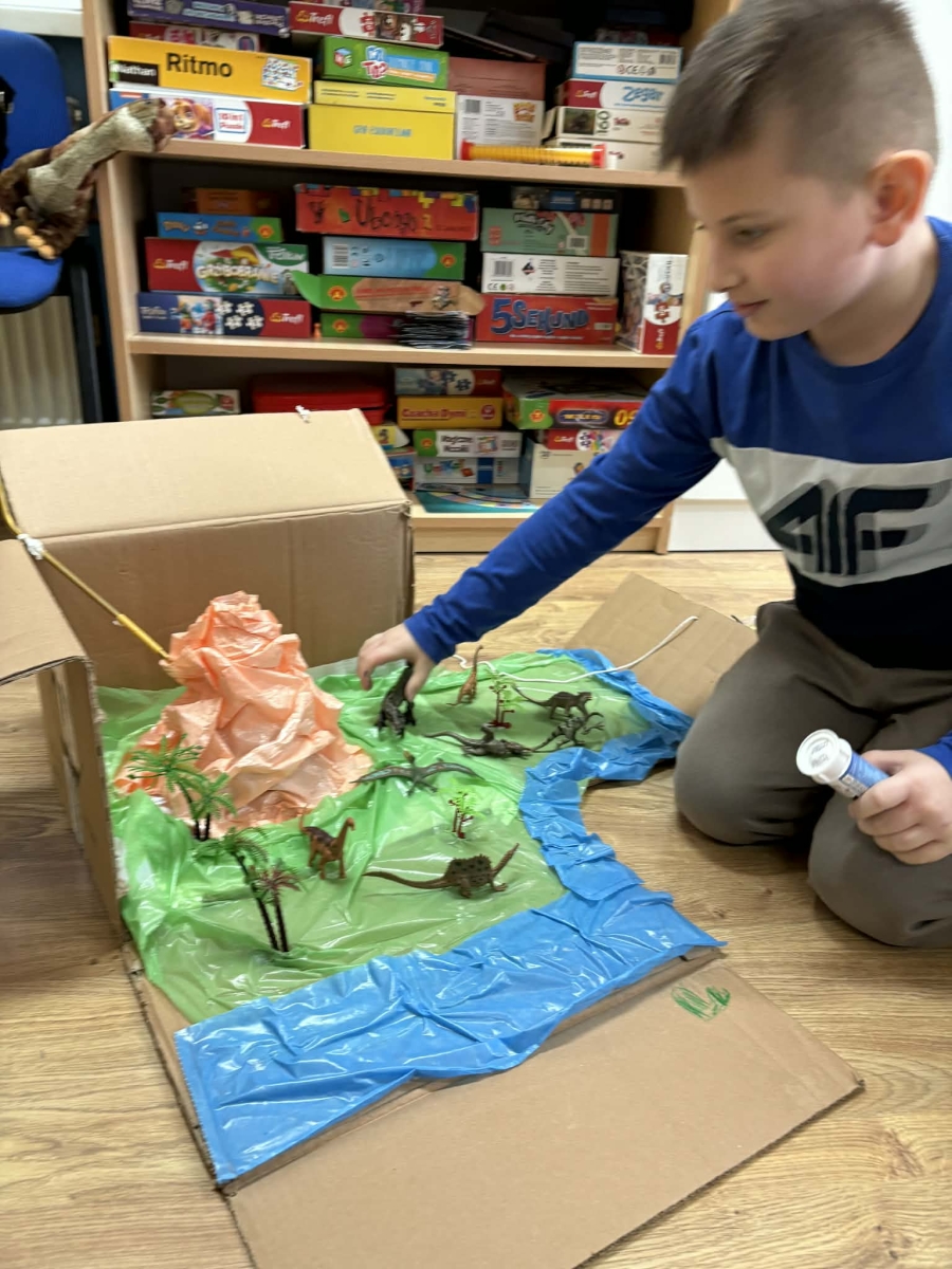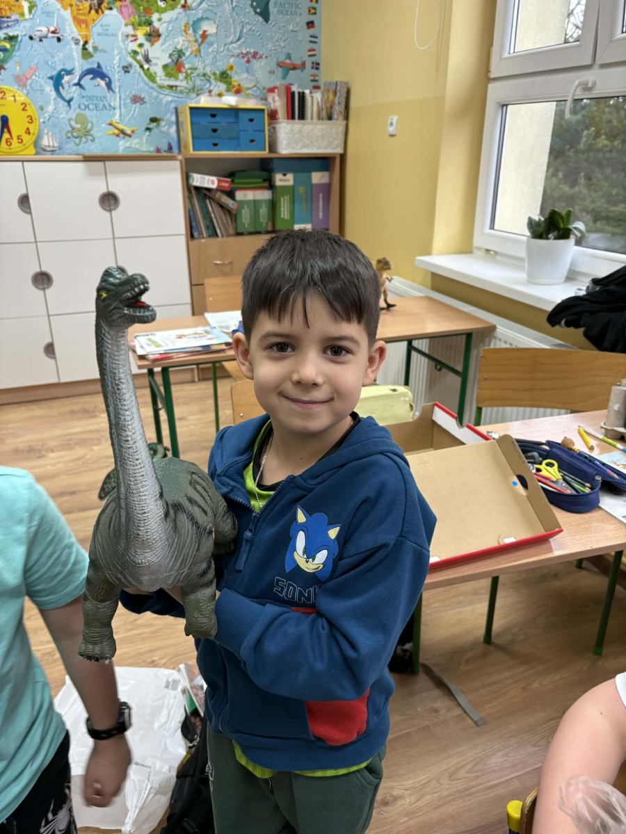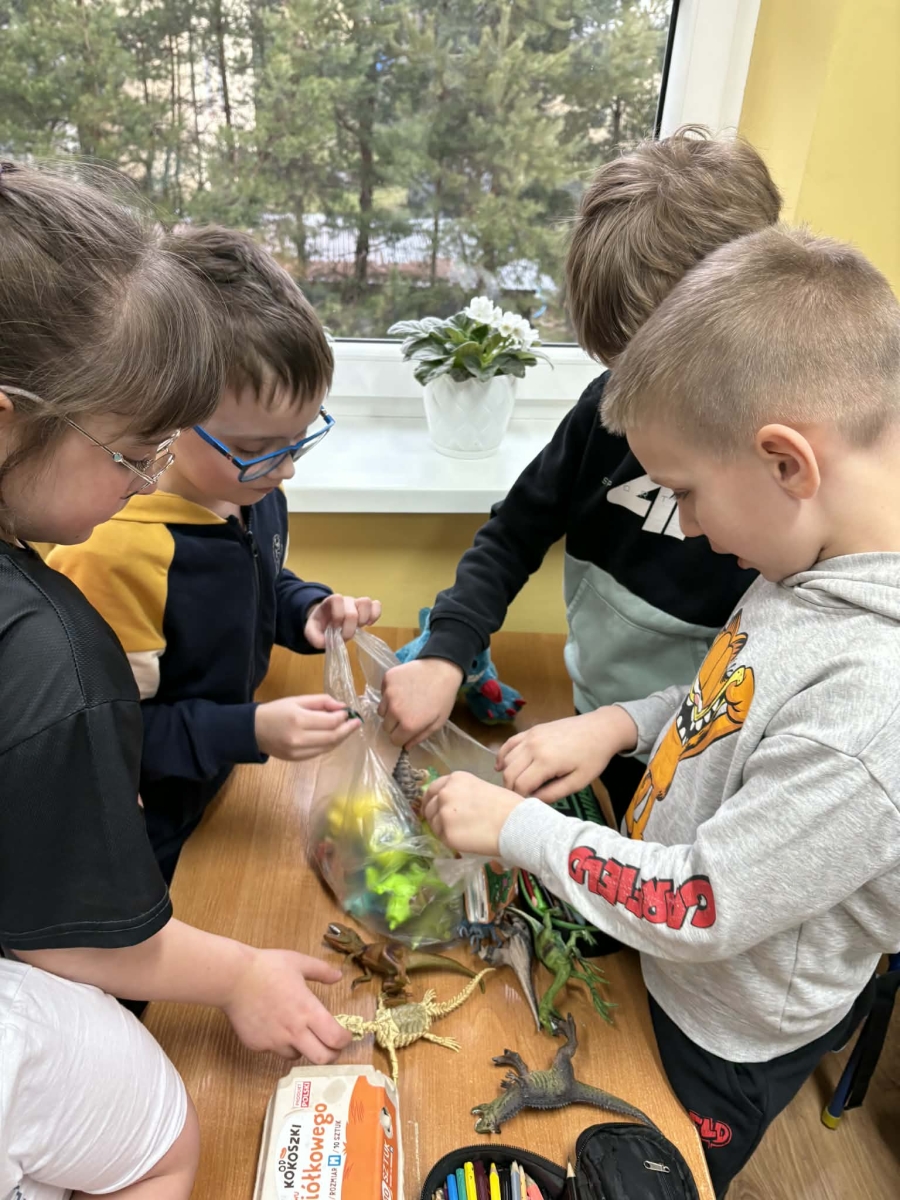 Dużo emocji wzbudziła zabawa polegająca na wykopywaniu dinozaurów z masy, podczas której dzieci wcielały się w małych paleontologów. Po odnalezieniu figurek próbowały odgadnąć, jaki to dinozaur. Niektórzy uczniowie przynieśli również swoje prywatne kolekcje figurek dinozaurów i zaprezentowali je kolegom i koleżankom z klasy.