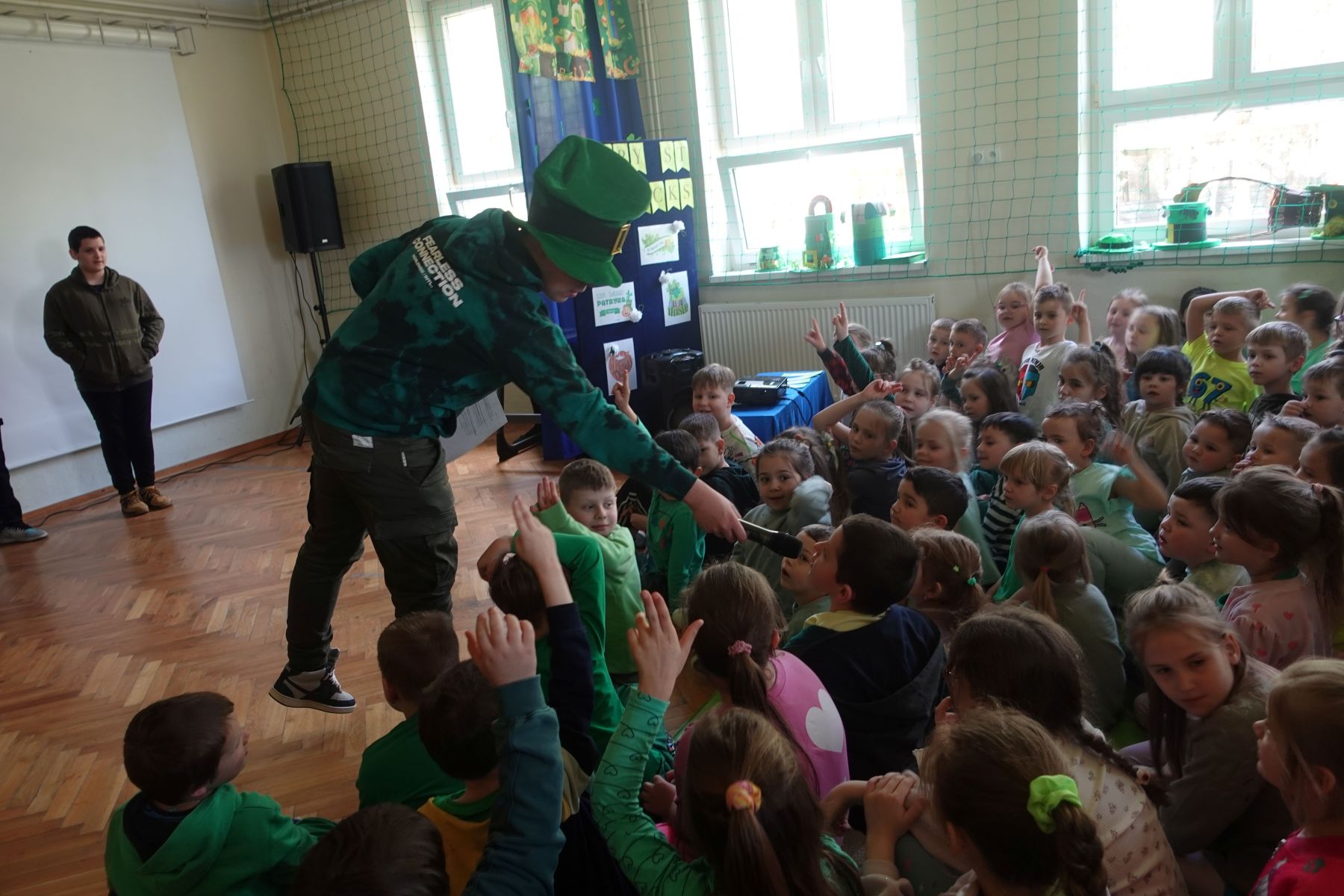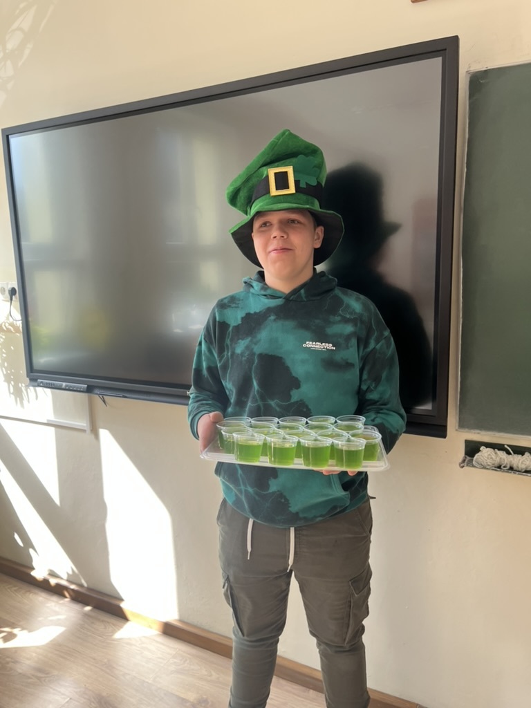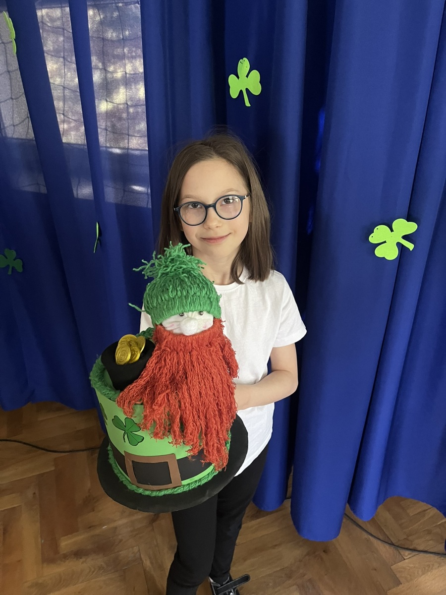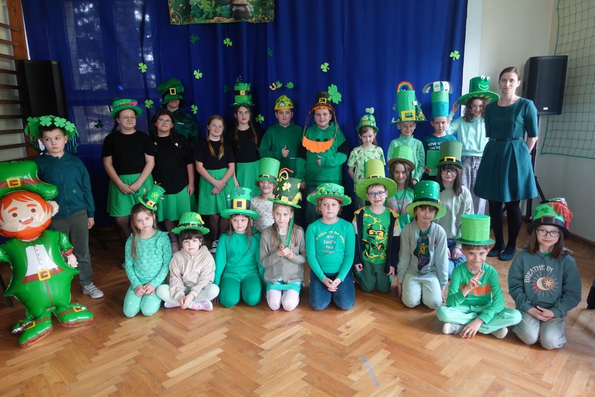 Nie zabrakło również muzyki i tańca – scena wypełniła się rytmicznymi dźwiękami, a energiczny taniec irlandzki porwał wszystkich do wspólnej zabawy. Duże zainteresowanie wzbudził konkurs na najbardziej oryginalne nakrycie głowy inspirowane tym świętem – kreatywność uczniów nie miała granic! Na zakończenie wydarzenia odwiedził nas skrzat Leprechaun, który w humorystycznym nagraniu przemówił do publiczności i podsumował całe spotkanie. Niespodziankę przygotował Samorząd Uczniowski – na uczniów czekały zielone galaretki, doskonale wpisujące się w klimat tego dnia. Ten wyjątkowy dzień pokazał, że nauka przez zabawę może być prawdziwą przygodą – pełną uśmiechu, energii i wspólnych doświadczeń.