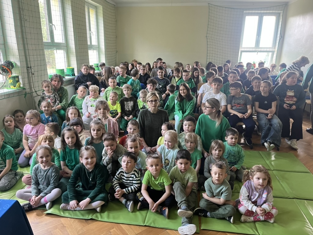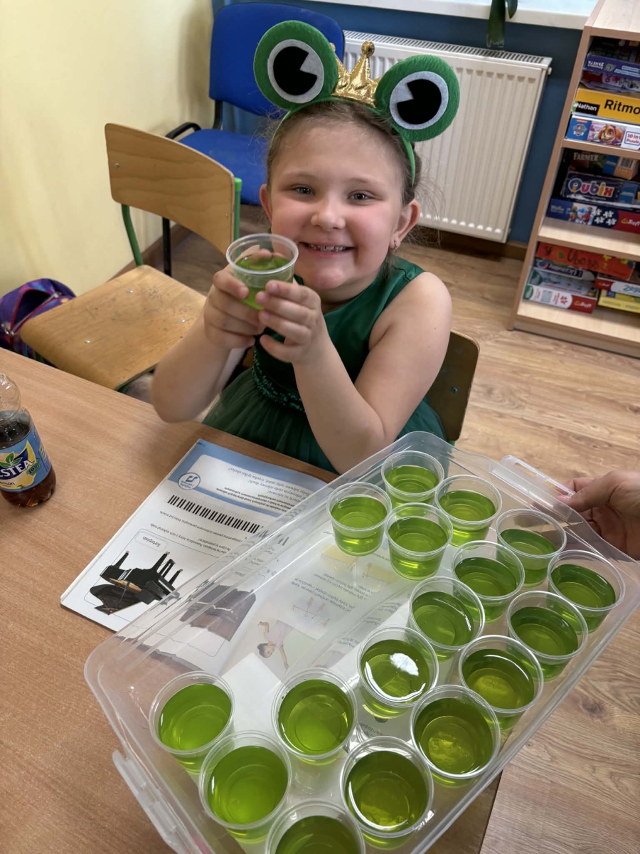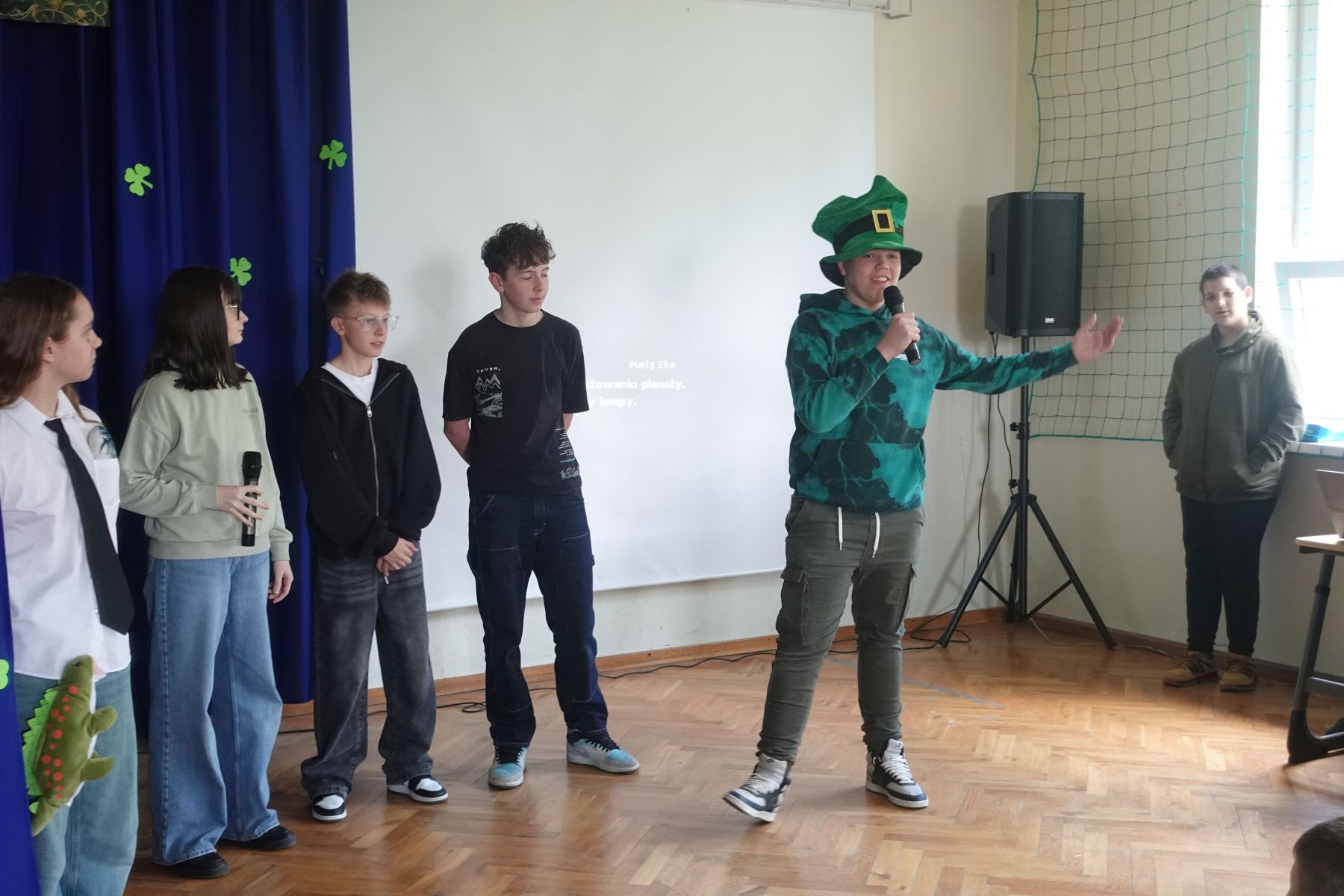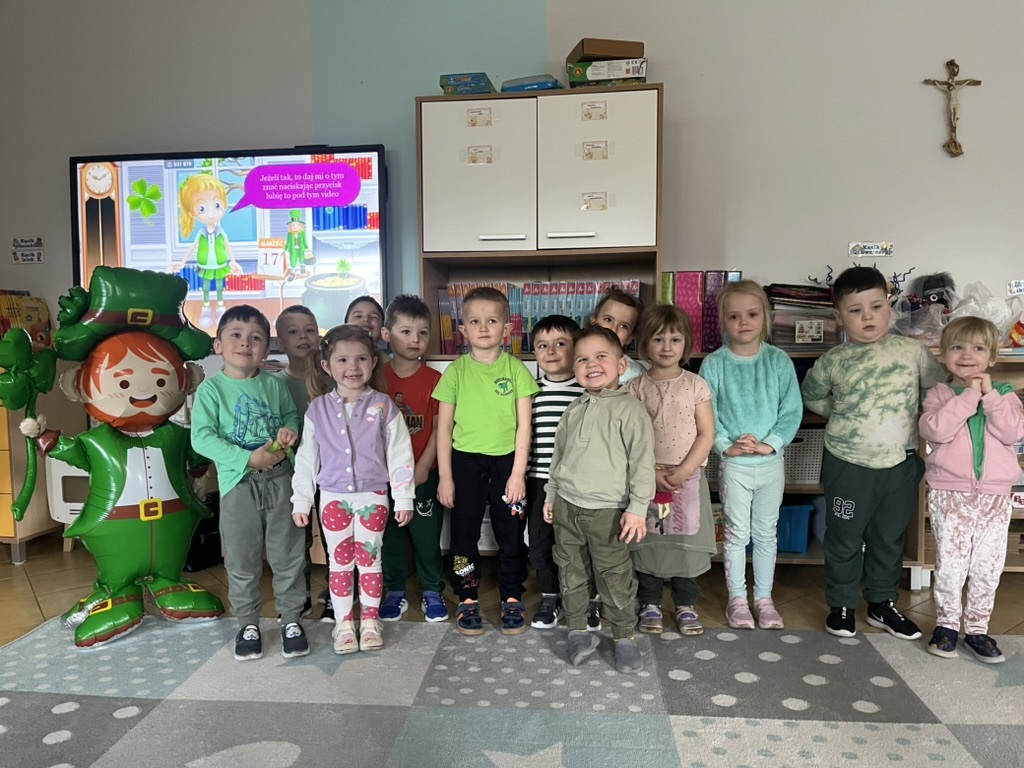 Nie zabrakło również muzyki i tańca – scena wypełniła się rytmicznymi dźwiękami, a energiczny taniec irlandzki porwał wszystkich do wspólnej zabawy. Duże zainteresowanie wzbudził konkurs na najbardziej oryginalne nakrycie głowy inspirowane tym świętem – kreatywność uczniów nie miała granic! Na zakończenie wydarzenia odwiedził nas skrzat Leprechaun, który w humorystycznym nagraniu przemówił do publiczności i podsumował całe spotkanie. Niespodziankę przygotował Samorząd Uczniowski – na uczniów czekały zielone galaretki, doskonale wpisujące się w klimat tego dnia. Ten wyjątkowy dzień pokazał, że nauka przez zabawę może być prawdziwą przygodą – pełną uśmiechu, energii i wspólnych doświadczeń.