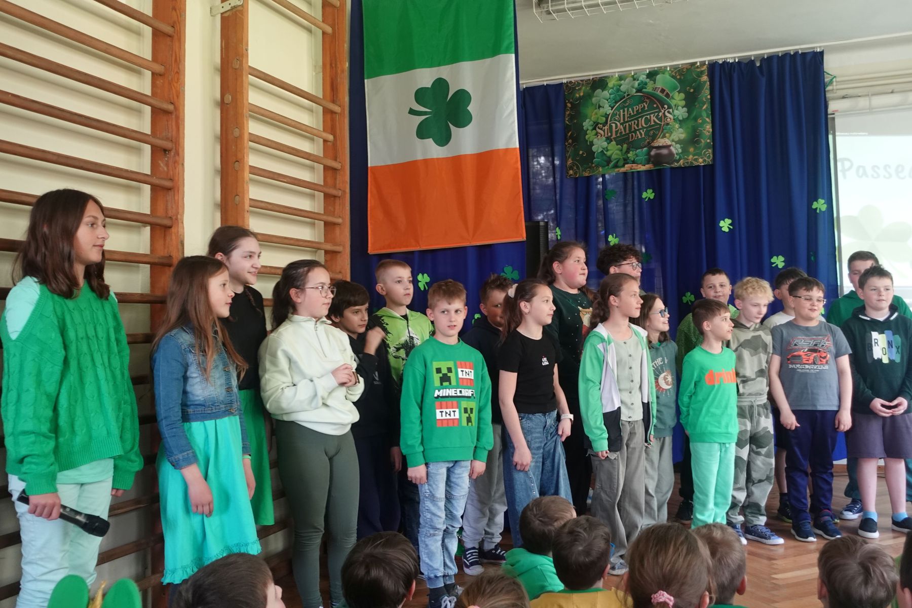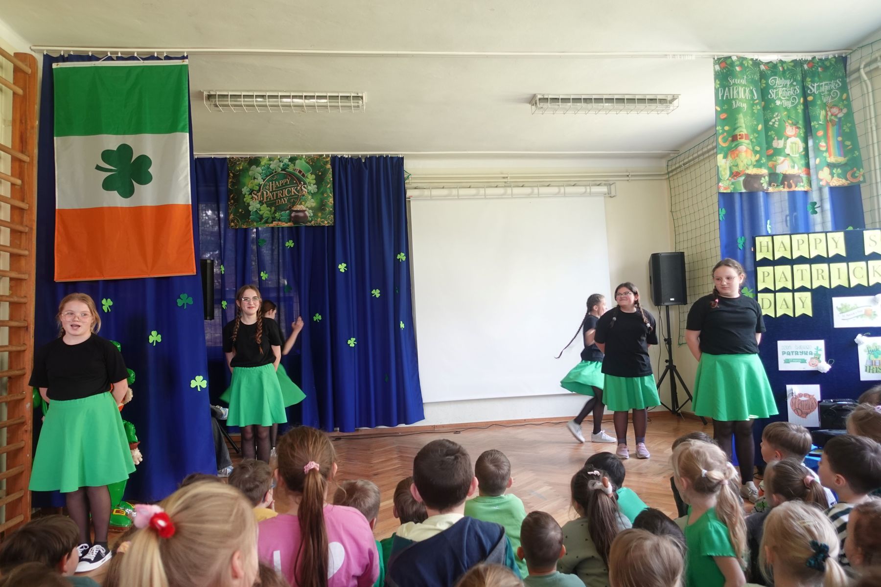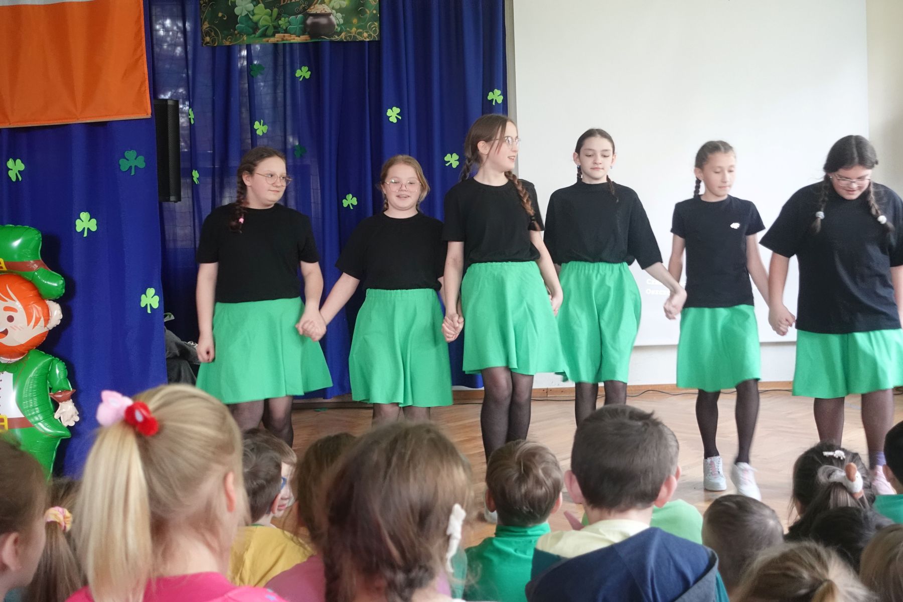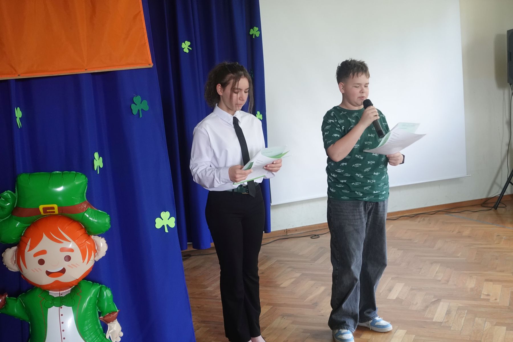 Na szkolnej scenie nie brakowało atrakcji – uczniowie zabrali nas w podróż po Irlandii dzięki prezentacji multimedialnej, rozbawili publiczność humorystycznym przedstawieniem z udziałem tajemniczego leprechauna oraz przedstawili autorskie wydanie „Irish News” – szkolnych wiadomości inspirowanych kulturą Irlandii.