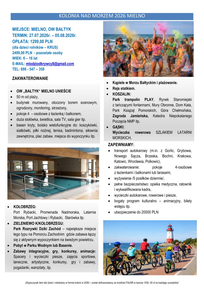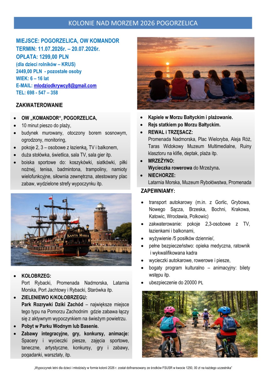 Prosimy o zapoznanie się z ofertą kolonii letnich , organizowanych przez Stowarzyszenie Sportu i Rekreacji „Młodzi Odkrywcy” z Nowego Sącza. Oferta skierowana jest do dzieci i młodzieży, których przynajmniej jedno z rodziców jest ubezpieczone w pełnym zakresie w KRUS.