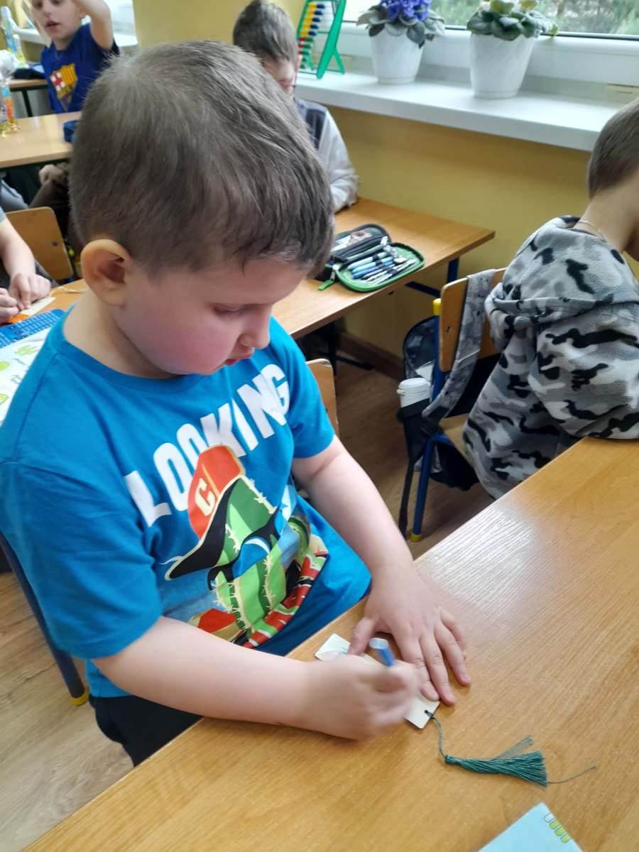 Chcąc kultywować piękną tradycję biblioteki, pierwszoklasiści stworzyli własne ilustracje do wybranych przez siebie książek, które wzbogacą katalog o nowe, wyjątkowe prace. Zwieńczeniem zajęć było ozdabianie drewnianych zakładek do książek, które z pewnością będą towarzyszyć uczniom podczas codziennych spotkań z lekturą.